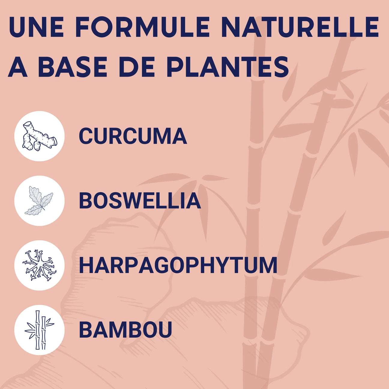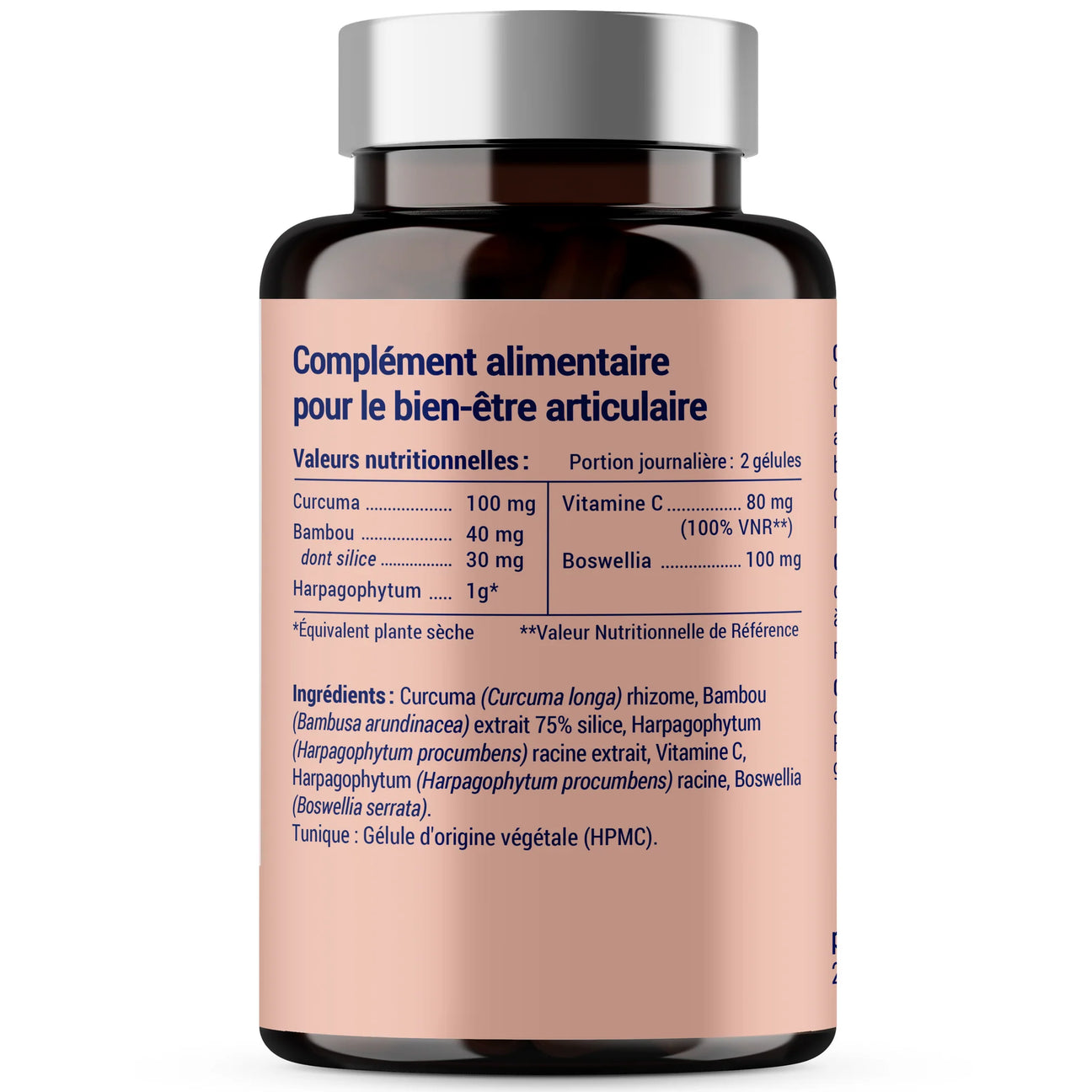 Curcuma (Curcuma longa) rhizome, Bambou (Bambusa arundinacea) extrait 75% silice, Harpagophytum (Harpagophytum procumbens) racine extrait, Vitamine C, Boswellia