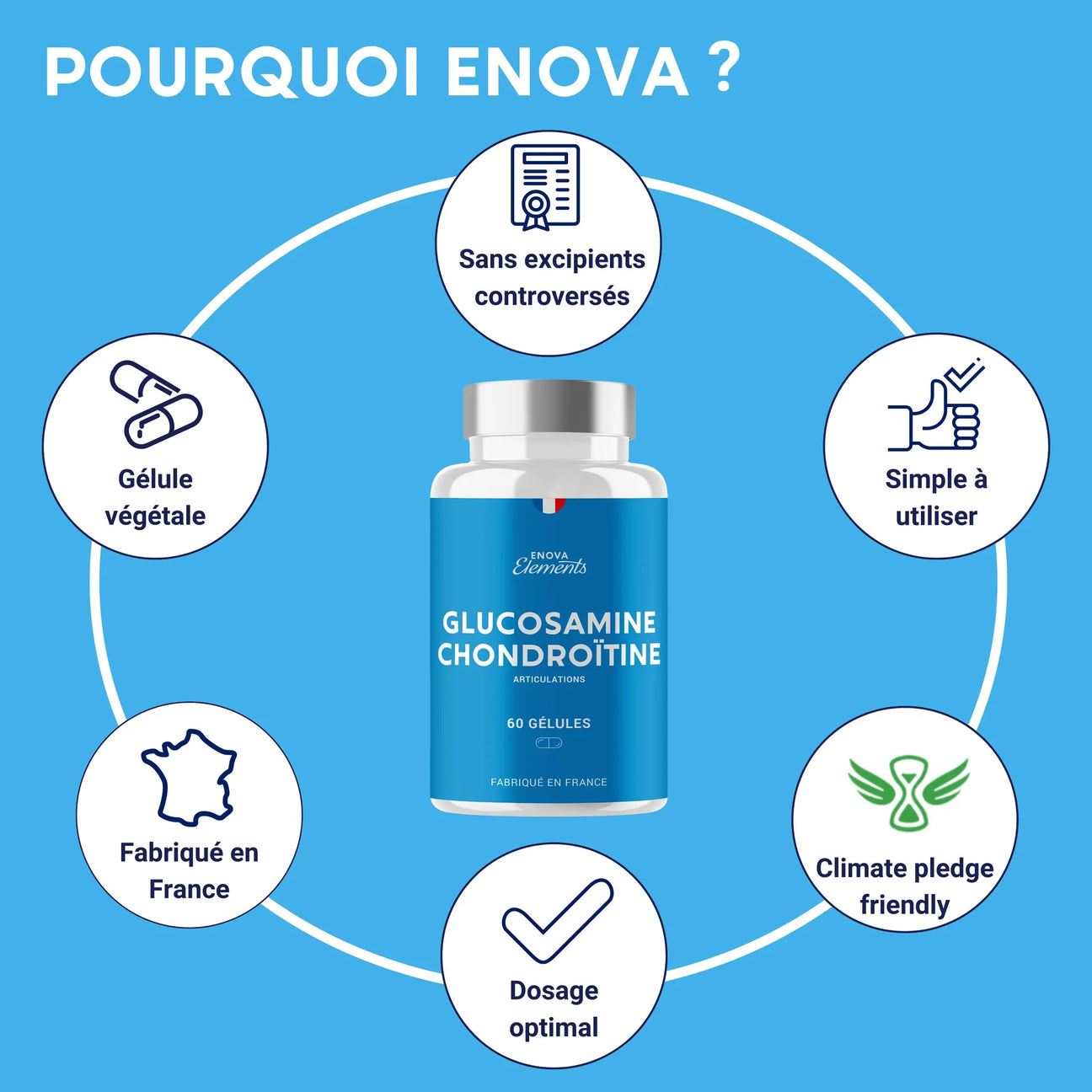 La Glucosamine + Chondroïtine Enova est le partenaire idéal pour quiconque souhaite agir activement sur la santé de ses articulations, quel que soit son âge ou son mode de vie.