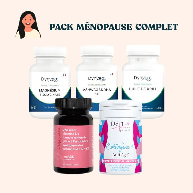 Mis au point par Marine Brame, notre naturopathe experte, qui est parti de l'excellente base de notre Pack Ménopause Essentiel (NuADK, Magnésium, Krill). Elle y a ajouté le Collagène Anti-Âge+ de Défi Forme et l'Ashwagandha Dynveo pour une couverture complète, qui renforce le bien-être mental, le sommeil et la partie articulaire.